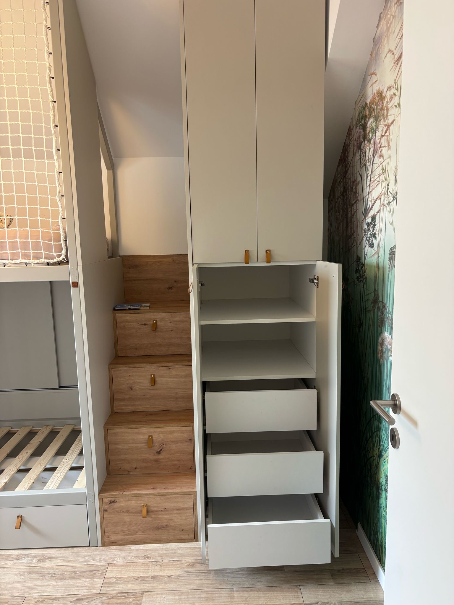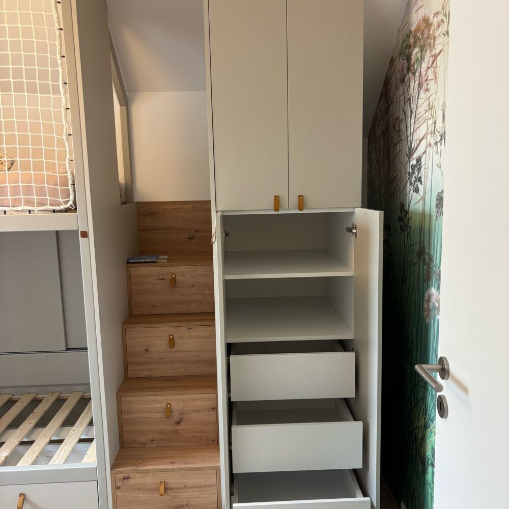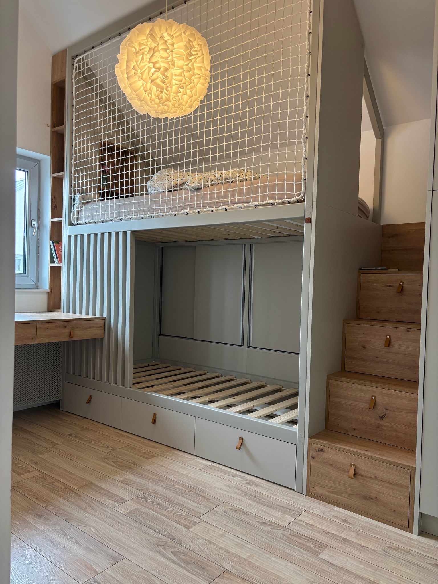 La parter, pe lungimea saltelei, este ascuns un dulap cu uși glisante, ideal pentru depozitarea jucăriilor, cărților sau lenjeriei